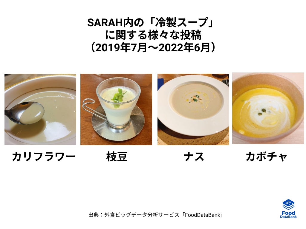 累計90万件以上のおいしい一皿が集まるグルメコミュニティサービス「SARAH」を運営する、株式会社SARAH(本社:東京・千代田、代表取締役:髙橋洋太)は、「外食トレンドニュース2022年7月号」を公開いたしました。ユーザーの投稿情報を外食ビッグデータ分析サービス「FoodDataBank」で分析したところ、冷製スープの夏の人気度が年々高まっていることがわかりました。「素材」で選ばれることが多い「冷製スープ」ですが、今後はどのような拡がりを見せるのか、口コミデータの分析結果をお伝えします。