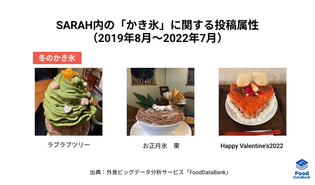 グルメコミュニティサービス「SARAH」内のかき氷に関する投稿推移を見てみると、夏の人気度が年々上昇しているだけでなく、12月〜2月の冬の時期にも人気が上昇傾向にあることがわかります。投稿詳細からも「クリスマス」や「お正月」「バレンタイン」の時期にもかき氷が食べられていることが分かりました。