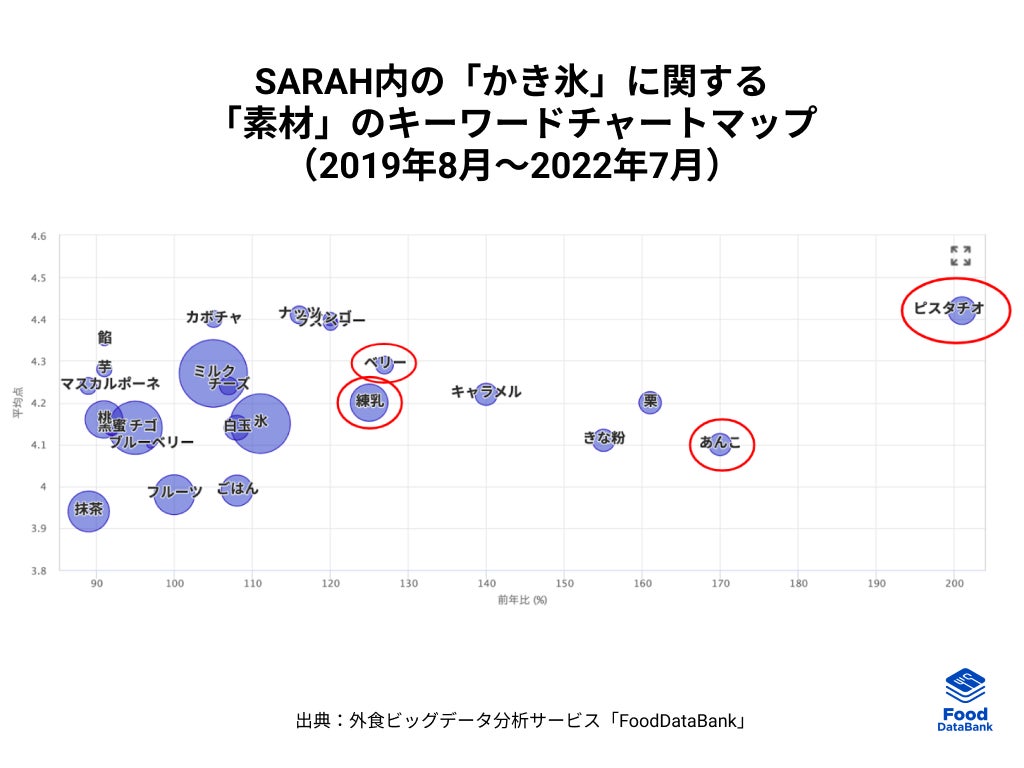 最も注目度の高かった「素材」のキーワードチャートマップを見ると、「ピスタチオ」「あんこ」「ベリー」「練乳」といったスイーツに使われる素材が多く出現していました。