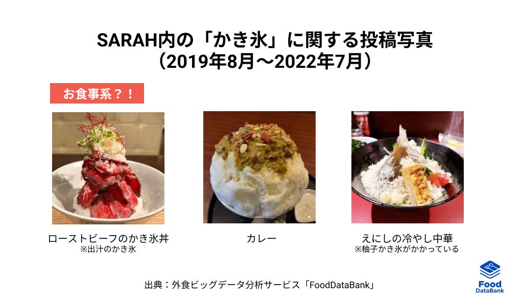 SARAH内の投稿では、圧倒的にスイーツ系のかき氷が多いながらも、出汁のかき氷にローストビーフが乗ったかき氷丼や、カレーがかかったかき氷など、お食事系のかき氷の投稿も見られました。