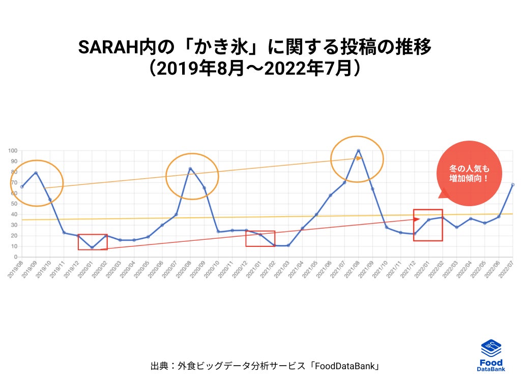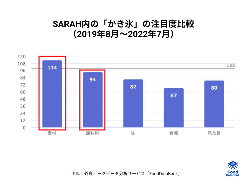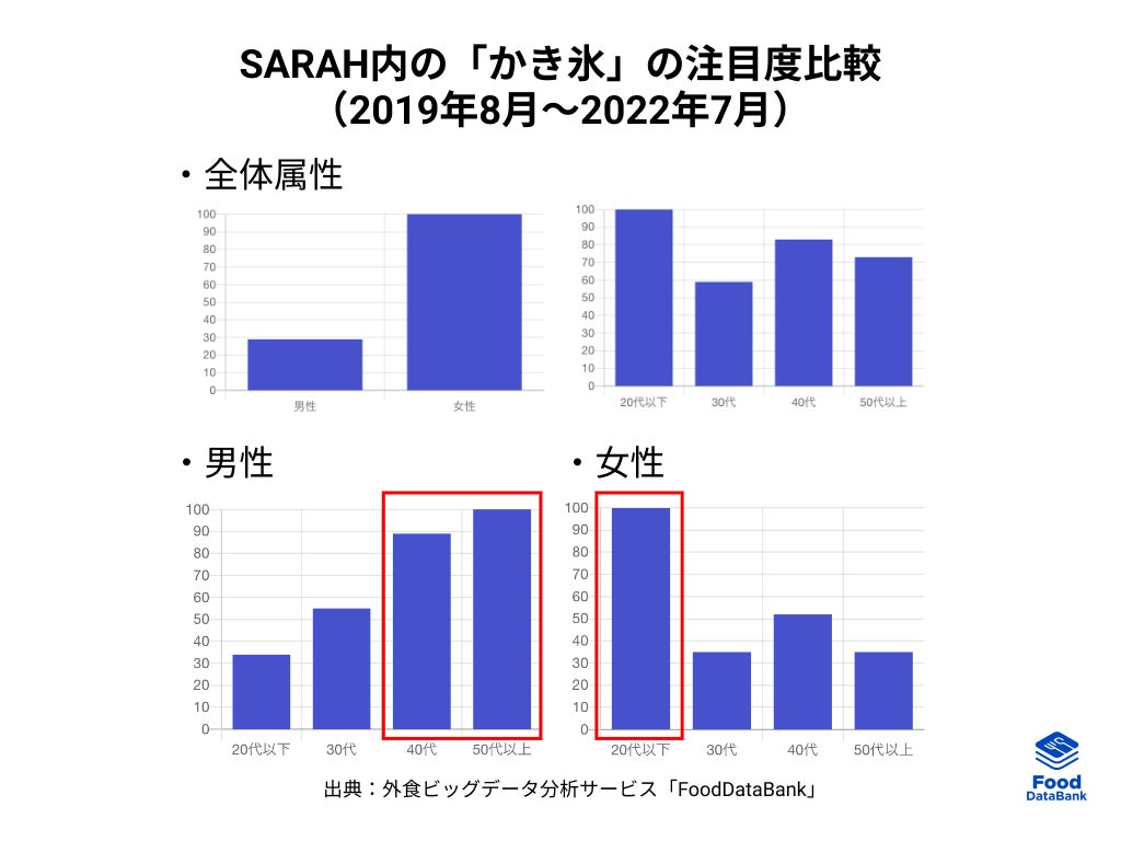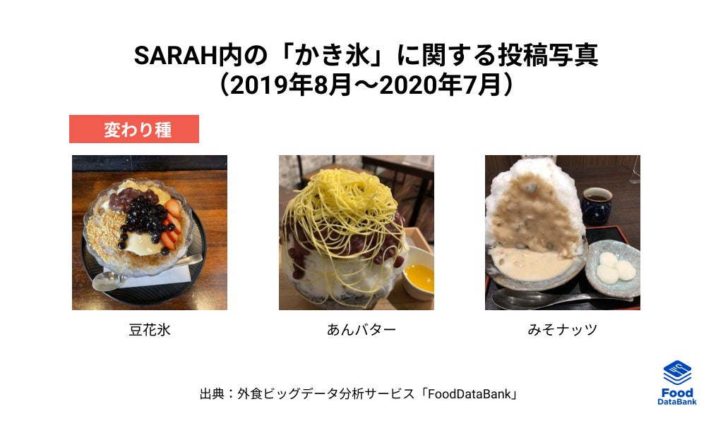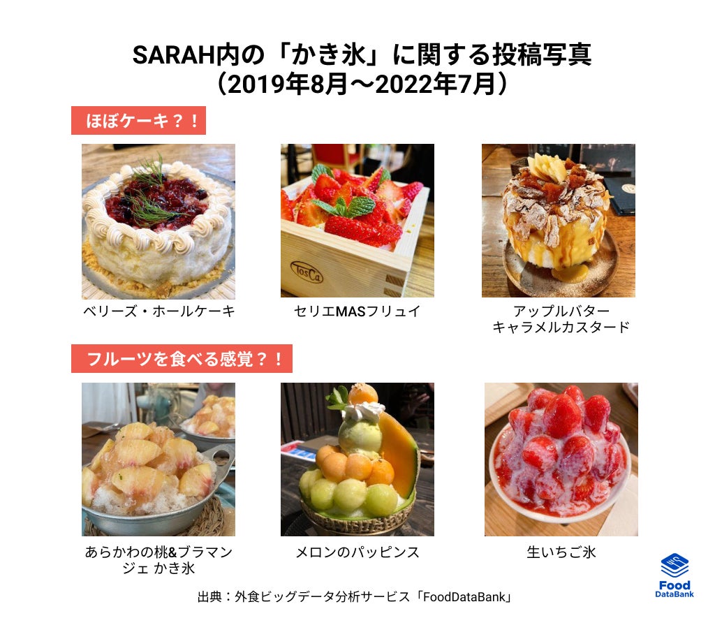 累計90万件以上のおいしい一皿が集まるグルメコミュニティサービス「SARAH」を運営する、株式会社SARAH(本社:東京・千代田、代表取締役:髙橋洋太)は、「FoodDataBank トレンドレポート2022年8月号」を公開いたしました。今月のテーマは、夏に人気が上昇する「かき氷」です。ユーザーの投稿情報を外食ビッグデータ分析サービス「FoodDataBank」で分析し、世代別の人気度や注目素材、季節性などの様々な観点から、バラエティ化が進む「かき氷」の今についてお伝えします。