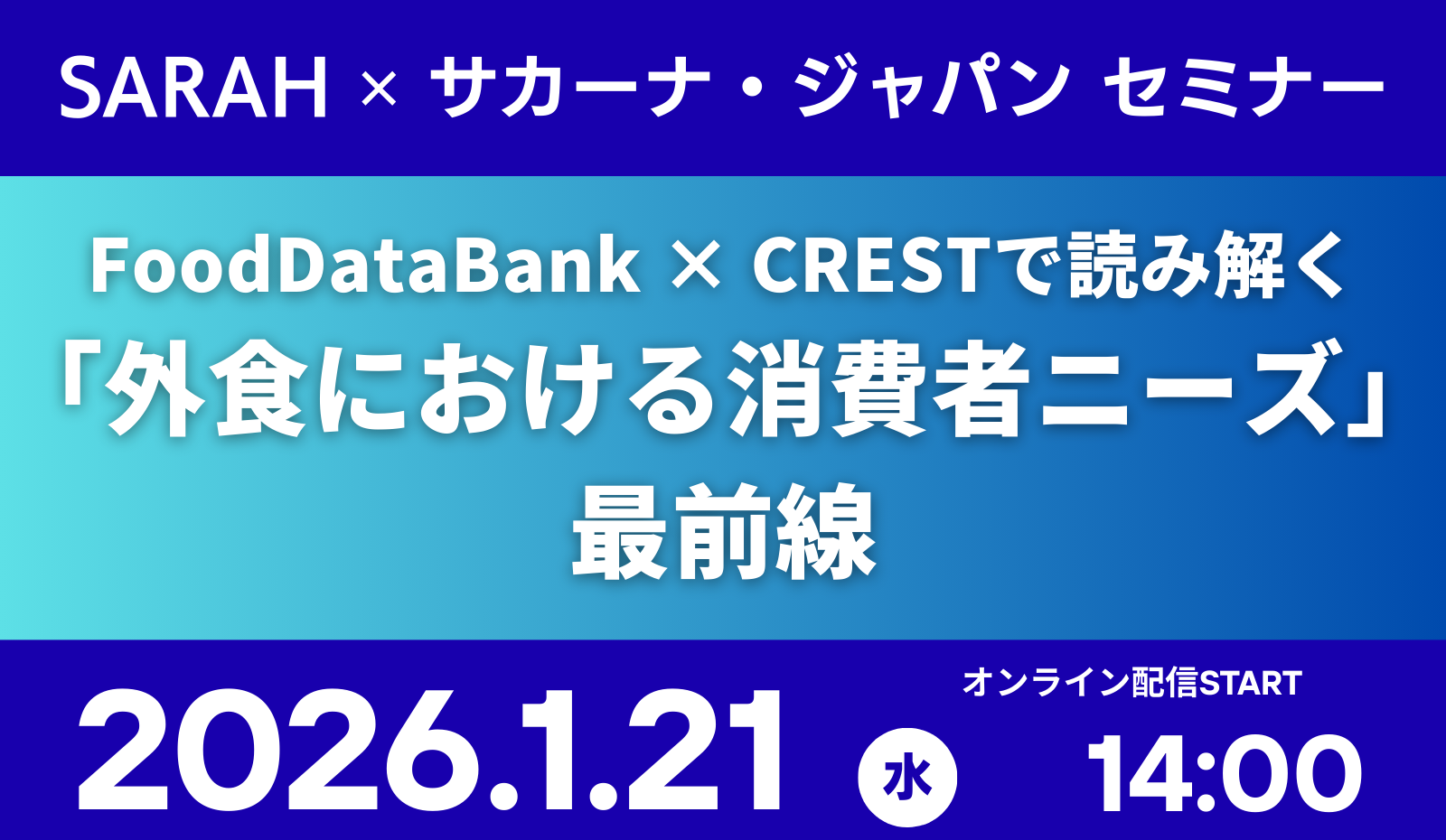 お知らせ 2026.01.22株式会社SARAHは株式会社サカーナ・ジャパンと共催で、2026年 1月 21日(水)にオンラインセミナー『FoodDataBank × CRESTで読み解く「外食における消費者ニーズ」最前線』を開催しました。 詳細につ […]